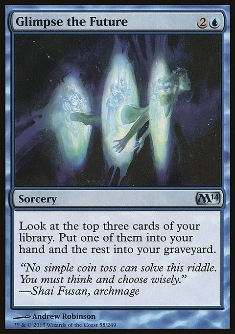 Look at the top three cards of your library. Put one of them into your hand and the rest into your graveyard.