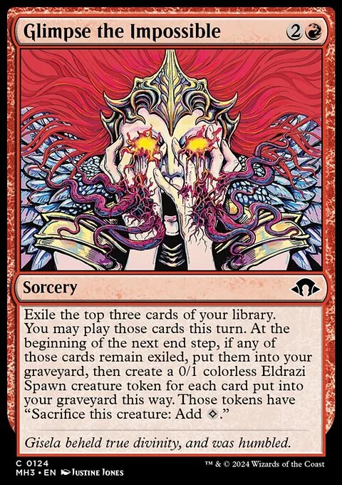 Exile the top three cards of your library. You may play those cards this turn. At the beginning of the next end step, if any of those cards remain exiled, put them into your graveyard, then create a 0/1 colorless Eldrazi Spawn creature token for each card put into your graveyard this way. Those tokens have "Sacrifice this token: Add {C}."