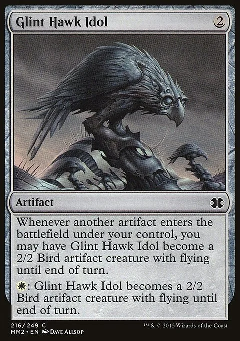 Whenever another artifact enters the battlefield under your control, you may have Glint Hawk Idol become a 2/2 Bird artifact creature with flying until end of turn. {W}: Glint Hawk Idol becomes a 2/2 Bird artifact creature with flying until end of turn.
