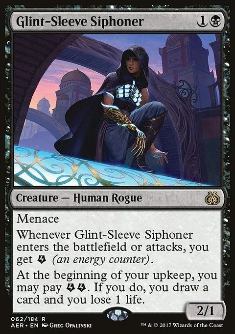 Menace Whenever Glint-Sleeve Siphoner enters the battlefield or attacks, you get {E} (an energy counter). At the beginning of your upkeep, you may pay {E}{E}. If you do, you draw a card and you lose 1 life.