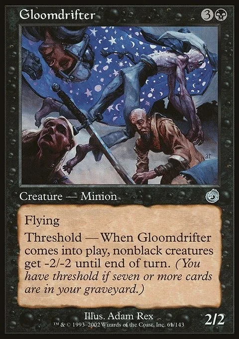 Flying Threshold — As long as seven or more cards are in your graveyard, Gloomdrifter has "When Gloomdrifter enters the battlefield, nonblack creatures get -2/-2 until end of turn."