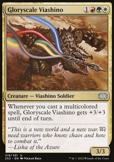 Whenever you cast a multicolored spell, Gloryscale Viashino gets +3/+3 until end of turn.