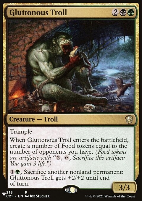 When this creature enters, create a number of Food tokens equal to the number of opponents you have. (Food tokens are artifacts with "{2}, {T}, Sacrifice this token: You gain 3 life.")