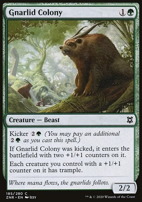 Kicker {2}{G} (You may pay an additional {2}{G} as you cast this spell.) If Gnarlid Colony was kicked, it enters the battlefield with two +1/+1 counters on it. Each creature you control with a +1/+1 counter on it has trample.