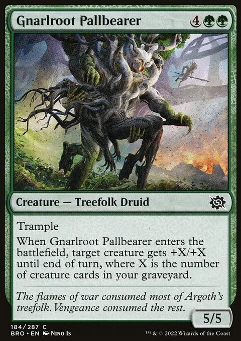 Trample When this creature enters, target creature gets +X/+X until end of turn, where X is the number of creature cards in your graveyard.