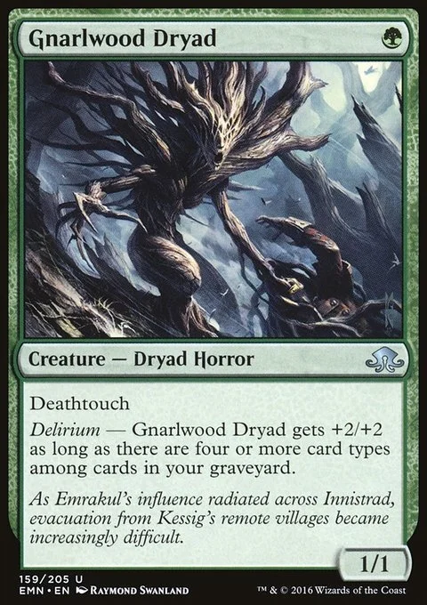 Deathtouch Delirium — Gnarlwood Dryad gets +2/+2 as long as there are four or more card types among cards in your graveyard.