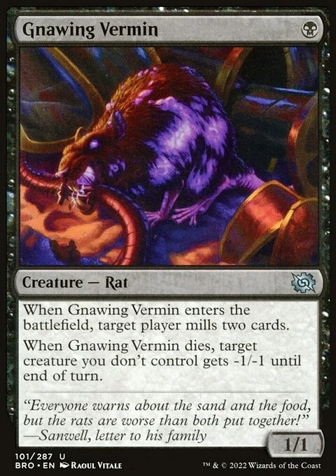 When Gnawing Vermin enters the battlefield, target player mills two cards. When Gnawing Vermin dies, target creature you don't control gets -1/-1 until end of turn.