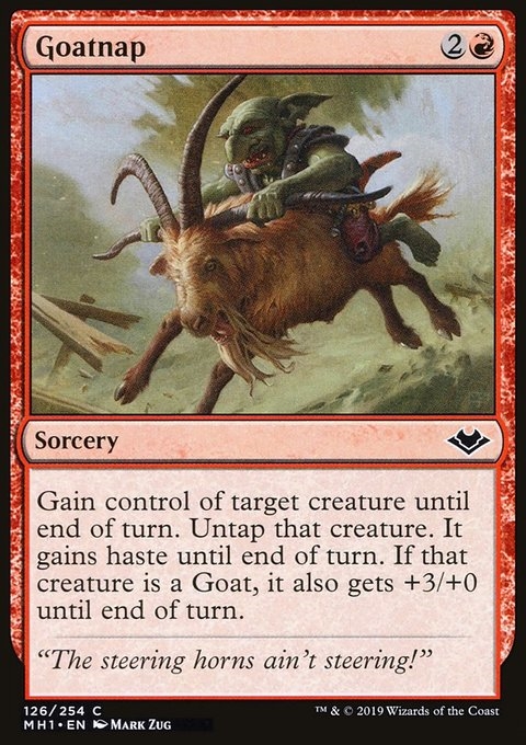 Gain control of target creature until end of turn. Untap that creature. It gains haste until end of turn. If that creature is a Goat, it also gets +3/+0 until end of turn.
