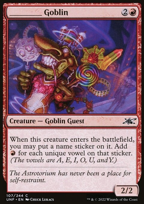 When this creature enters, you may put a name sticker on it. Add {R} for each unique vowel on that sticker. (The vowels are A, E, I, O, U, and Y.)