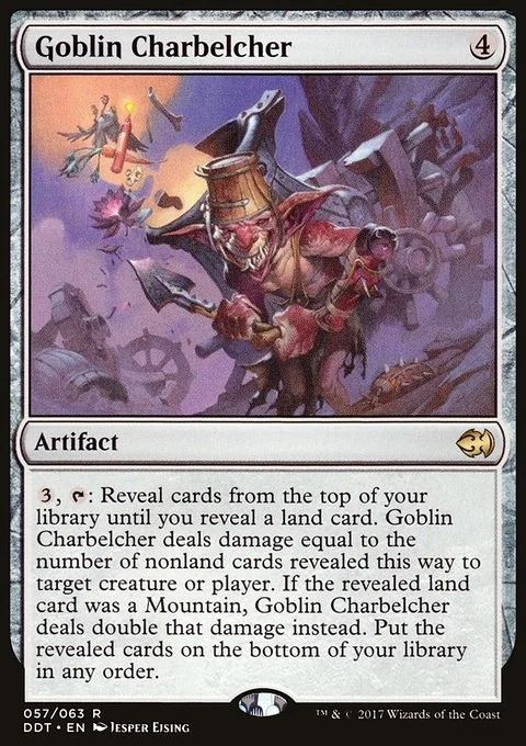 {3}, {T}: Reveal cards from the top of your library until you reveal a land card. Goblin Charbelcher deals damage equal to the number of nonland cards revealed this way to any target. If the revealed land card was a Mountain, Goblin Charbelcher deals double that damage instead. Put the revealed cards on the bottom of your library in any order.