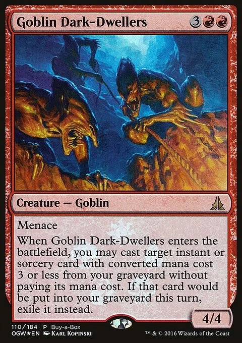 Menace When Goblin Dark-Dwellers enters the battlefield, you may cast target instant or sorcery card with converted mana cost 3 or less from your graveyard without paying its mana cost. If that card would be put into your graveyard this turn, exile it instead.