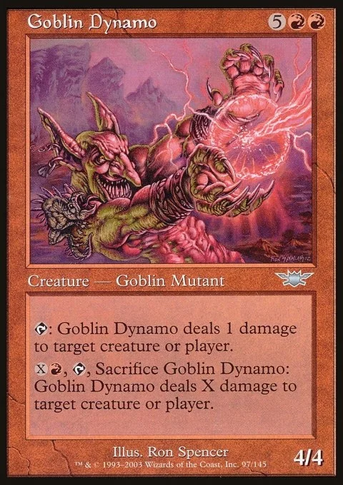 TAP: Goblin Dynamo deals 1 damage to target creature or player. . XR, TAP, Sacrifice Goblin Dynamo: Goblin Dynamo deals X damage to target creature or player.