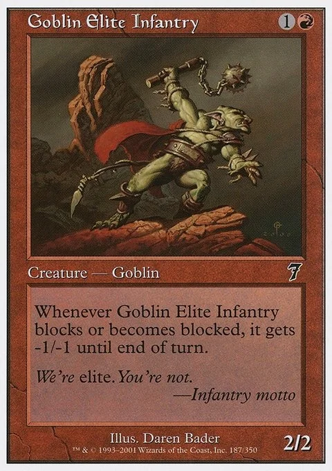 Whenever Goblin Elite Infantry blocks or becomes blocked, it gets -1/-1 until end of turn.