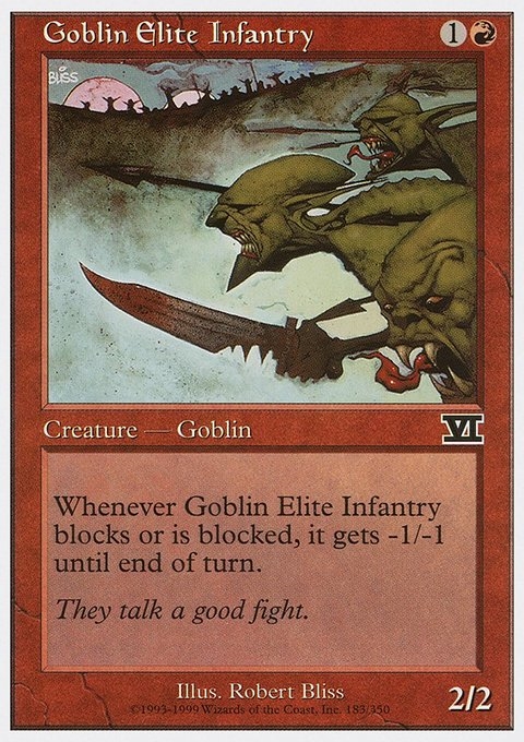 Whenever Goblin Elite Infantry blocks or becomes blocked, it gets -1/-1 until end of turn.