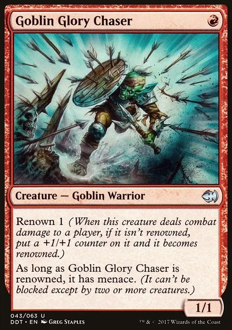 Renown 1 (When this creature deals combat damage to a player, if it isn't renowned, put a +1/+1 counter on it and it becomes renowned.) As long as Goblin Glory Chaser is renowned, it has menace. (It can't be blocked except by two or more creatures.)