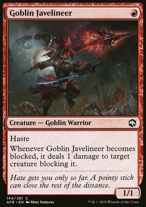 Haste Whenever Goblin Javelineer becomes blocked, it deals 1 damage to target creature blocking it.