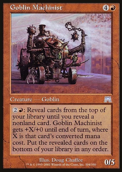 {2}{R}: Reveal cards from the top of your library until you reveal a nonland card. Goblin Machinist gets +X/+0 until end of turn, where X is that card's mana value. Put the revealed cards on the bottom of your library in any order.