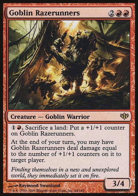 {1}{R}, Sacrifice a land: Put a +1/+1 counter on Goblin Razerunners. At the beginning of your end step, you may have Goblin Razerunners deal damage equal to the number of +1/+1 counters on it to target player or planeswalker.