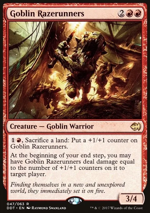 {1}{R}, Sacrifice a land: Put a +1/+1 counter on Goblin Razerunners. At the beginning of your end step, you may have Goblin Razerunners deal damage equal to the number of +1/+1 counters on it to target player or planeswalker.