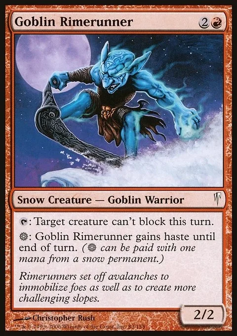 {T}: Target creature can't block this turn. {S}: Goblin Rimerunner gains haste until end of turn. ({S} can be paid with one mana from a snow source.)
