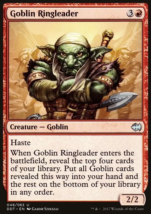 Haste (This creature can attack and {T} as soon as it comes under your control.) When Goblin Ringleader enters, reveal the top four cards of your library. Put all Goblin cards revealed this way into your hand and the rest on the bottom of your library in any order.