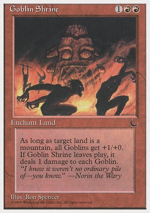 Enchant land As long as enchanted land is a basic Mountain, Goblin creatures get +1/+0. When this Aura leaves the battlefield, it deals 1 damage to each Goblin creature.