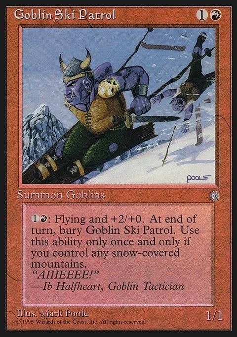 {1}{R}: Goblin Ski Patrol gets +2/+0 and gains flying. Its controller sacrifices it at the beginning of the next end step. Activate only once and only if you control a snow Mountain.