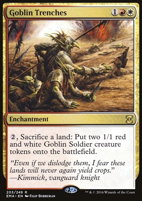{2}, Sacrifice a land: Create two 1/1 red and white Goblin Soldier creature tokens.