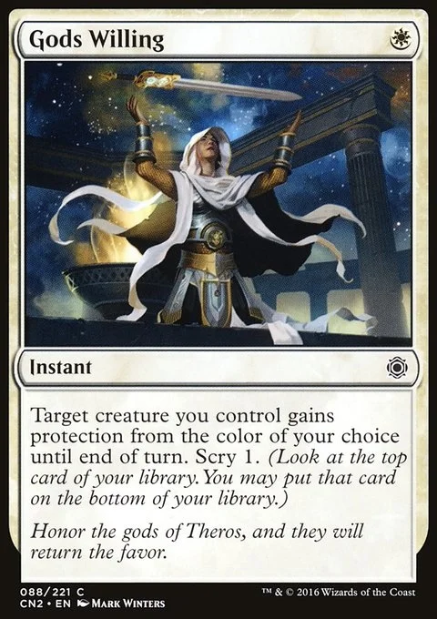 Target creature you control gains protection from the color of your choice until end of turn. (It can't be blocked, targeted, dealt damage, enchanted, or equipped by anything of that color.) Scry 1.