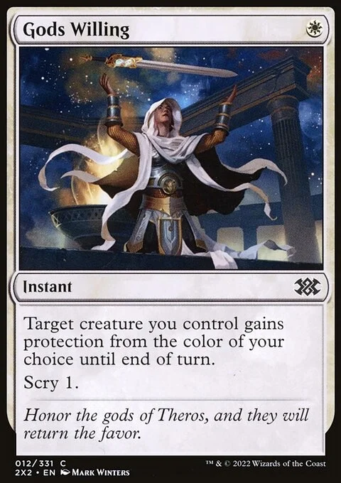 Target creature you control gains protection from the color of your choice until end of turn. (It can't be blocked, targeted, dealt damage, enchanted, or equipped by anything of that color.) Scry 1.