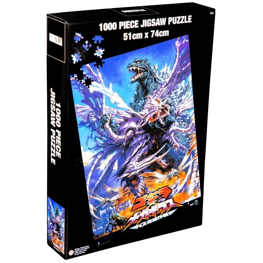 Have a smashing great time with this 1000 piece jigsaw puzzle featuring poster artwork of Japan's King of Monsters, Godzilla, seen fighting Megaguirus. Measuring at 51cm x 74cm, it won't be too monstrous for the dining table.