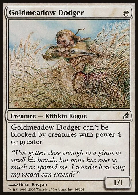 Goldmeadow Dodger can't be blocked by creatures with power 4 or greater.