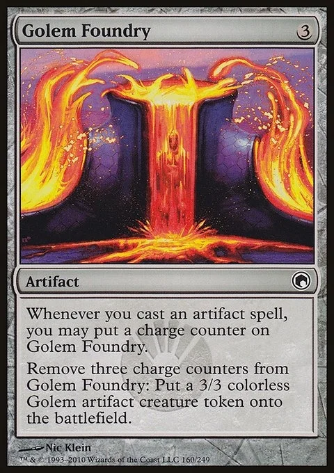 Whenever you cast an artifact spell, you may put a charge counter on Golem Foundry. Remove three charge counters from Golem Foundry: Create a 3/3 colorless Golem artifact creature token.