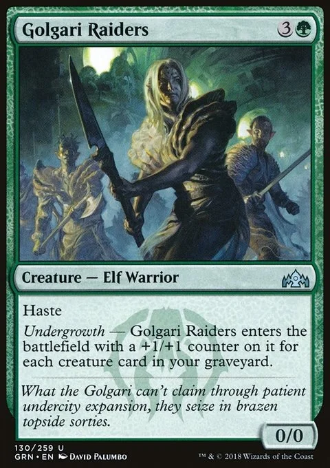 Haste Undergrowth — Golgari Raiders enters the battlefield with a +1/+1 counter on it for each creature card in your graveyard.