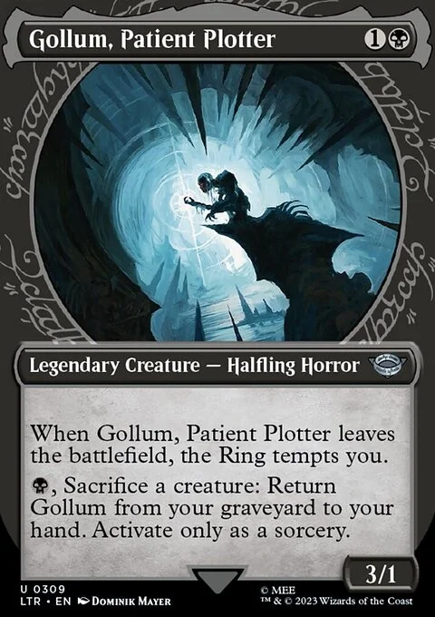 When Gollum, Patient Plotter leaves the battlefield, the Ring tempts you. {B}, Sacrifice a creature: Return Gollum from your graveyard to your hand. Activate only as a sorcery.