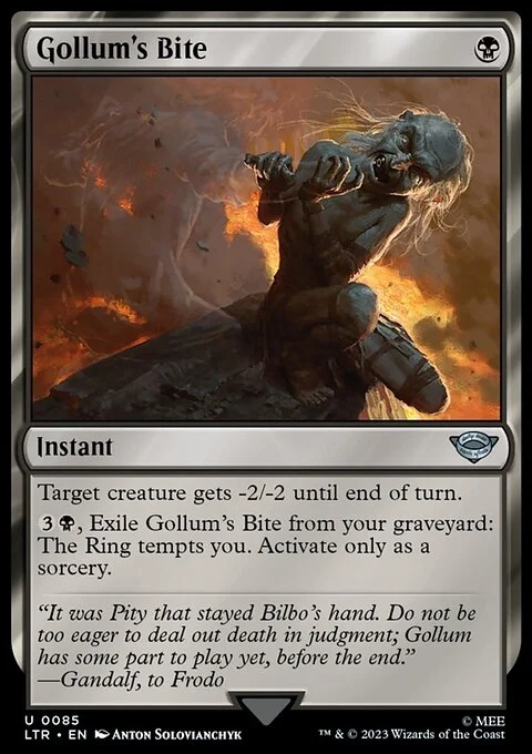 Target creature gets -2/-2 until end of turn. {3}{B}, Exile Gollum's Bite from your graveyard: The Ring tempts you. Activate only as a sorcery.