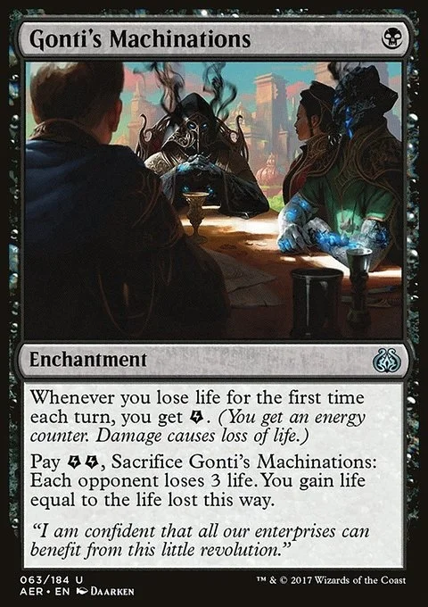 Whenever you lose life for the first time each turn, you get {E}. (You get an energy counter. Damage causes loss of life.) Pay {E}{E}, Sacrifice Gonti's Machinations: Each opponent loses 3 life. You gain life equal to the life lost this way.