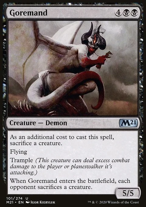 As an additional cost to cast this spell, sacrifice a creature. Flying Trample (This creature can deal excess combat damage to the player or planeswalker it's attacking.) When Goremand enters the battlefield, each opponent sacrifices a creature.