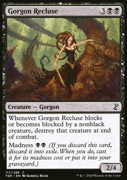 Whenever Gorgon Recluse blocks or becomes blocked by a nonblack creature, destroy that creature at end of combat. Madness {B}{B} (If you discard this card, discard it into exile. When you do, cast it for its madness cost or put it into your graveyard.)