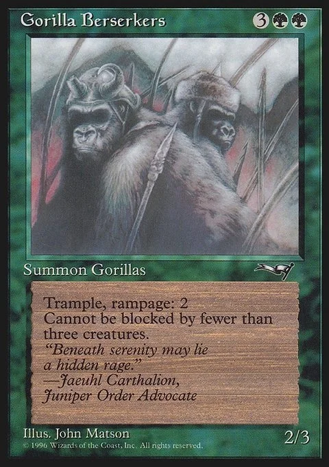Trample; rampage 2 (Whenever this creature becomes blocked, it gets +2/+2 until end of turn for each creature blocking it beyond the first.) Gorilla Berserkers can't be blocked except by three or more creatures.