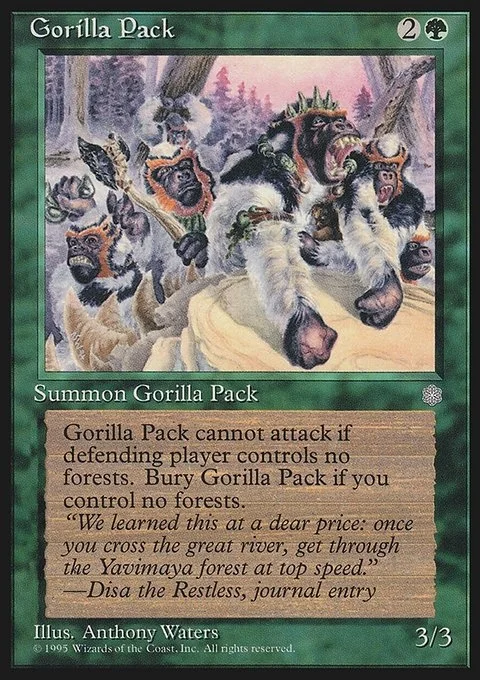 Gorilla Pack can't attack unless defending player controls a Forest. When you control no Forests, sacrifice Gorilla Pack.