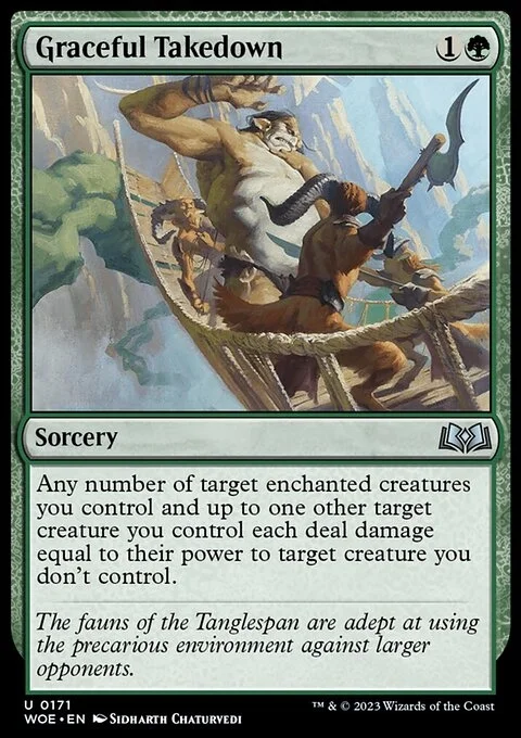 Any number of target enchanted creatures you control and up to one other target creature you control each deal damage equal to their power to target creature you don't control.