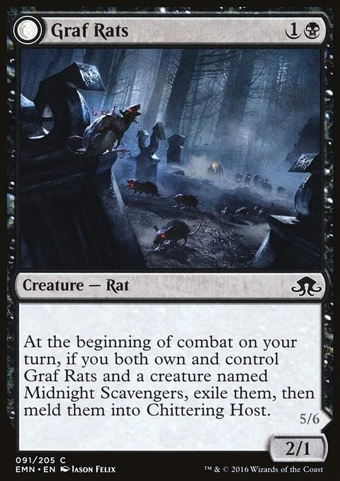 At the beginning of combat on your turn, if you both own and control this creature and a creature named Midnight Scavengers, exile them, then meld them into Chittering Host.