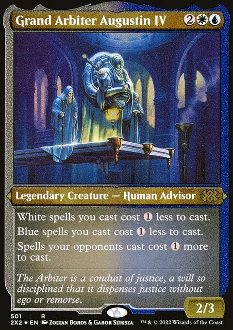 White spells you cast cost {1} less to cast. Blue spells you cast cost {1} less to cast. Spells your opponents cast cost {1} more to cast.