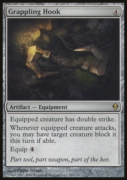 Equipped creature has double strike. Whenever equipped creature attacks, you may have target creature block it this turn if able. Equip {4}
