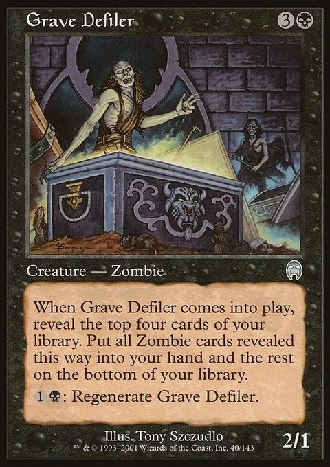 When Grave Defiler enters the battlefield, reveal the top four cards of your library. Put all Zombie cards revealed this way into your hand and the rest on the bottom of your library in any order. {1}{B}: Regenerate Grave Defiler.