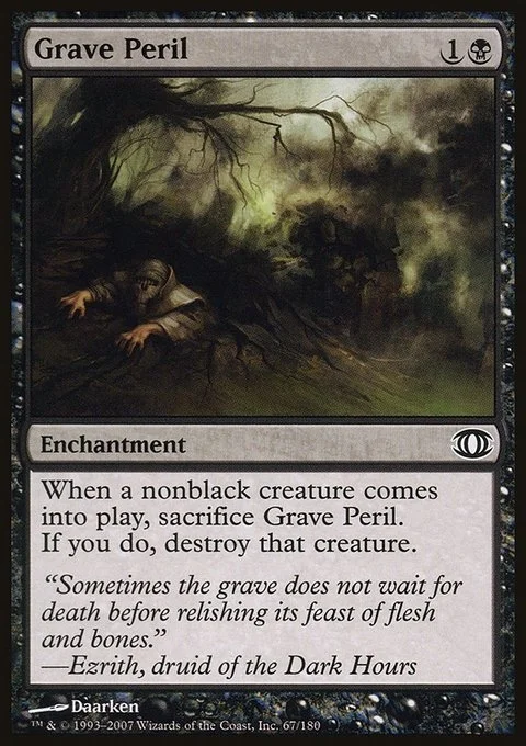 When a nonblack creature enters, sacrifice Grave Peril. If you do, destroy that creature.