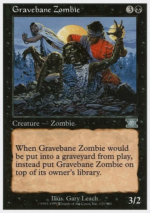When Gravebane Zombie would be put into a graveyard from play, instead put Gravebane Zombie on top of its owner’s library.