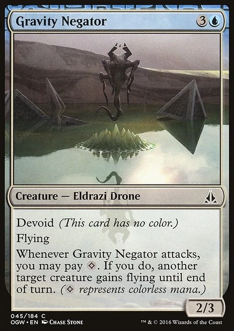 Devoid (This card has no color.) Flying Whenever Gravity Negator attacks, you may pay {C}. If you do, another target creature gains flying until end of turn. ({C} represents colorless mana.)