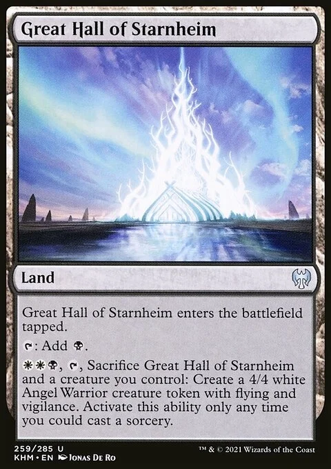 Great Hall of Starnheim enters the battlefield tapped. {T}: Add {B}. {W}{W}{B}, {T}, Sacrifice Great Hall of Starnheim and a creature you control: Create a 4/4 white Angel Warrior creature token with flying and vigilance. Activate only as a sorcery.